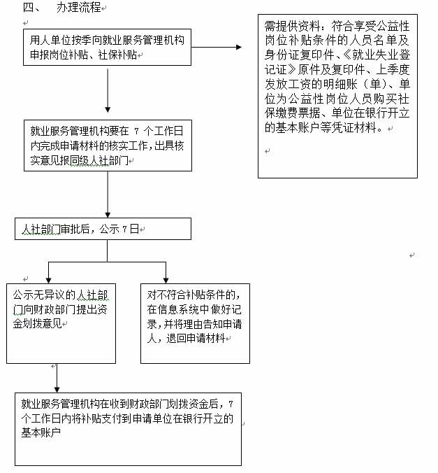 受理用人單位申報(bào)公益性崗位補(bǔ)貼、社保補(bǔ)貼資料,審核、撥付公益性崗位補(bǔ)貼、社保補(bǔ)貼。